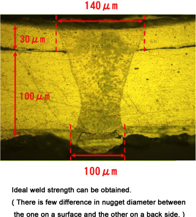◢ Cross section of a welded point (Stainless steel, t=0.03mm×0.1mm)