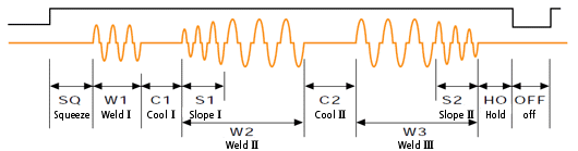 | "SQUEEZE," "WELD II," "COOL II," "WELD III," "SLOPE II," "HOLD," "OFF" 00 - 99cycles | ||